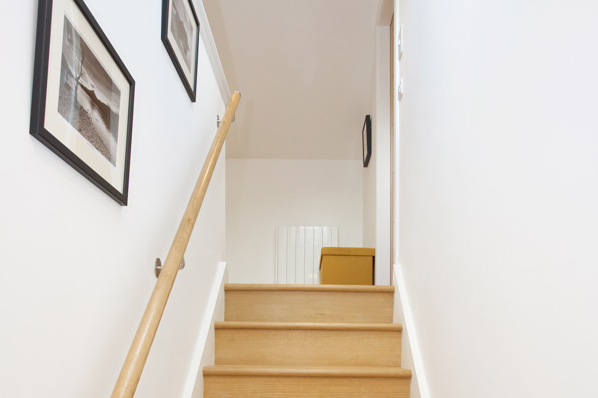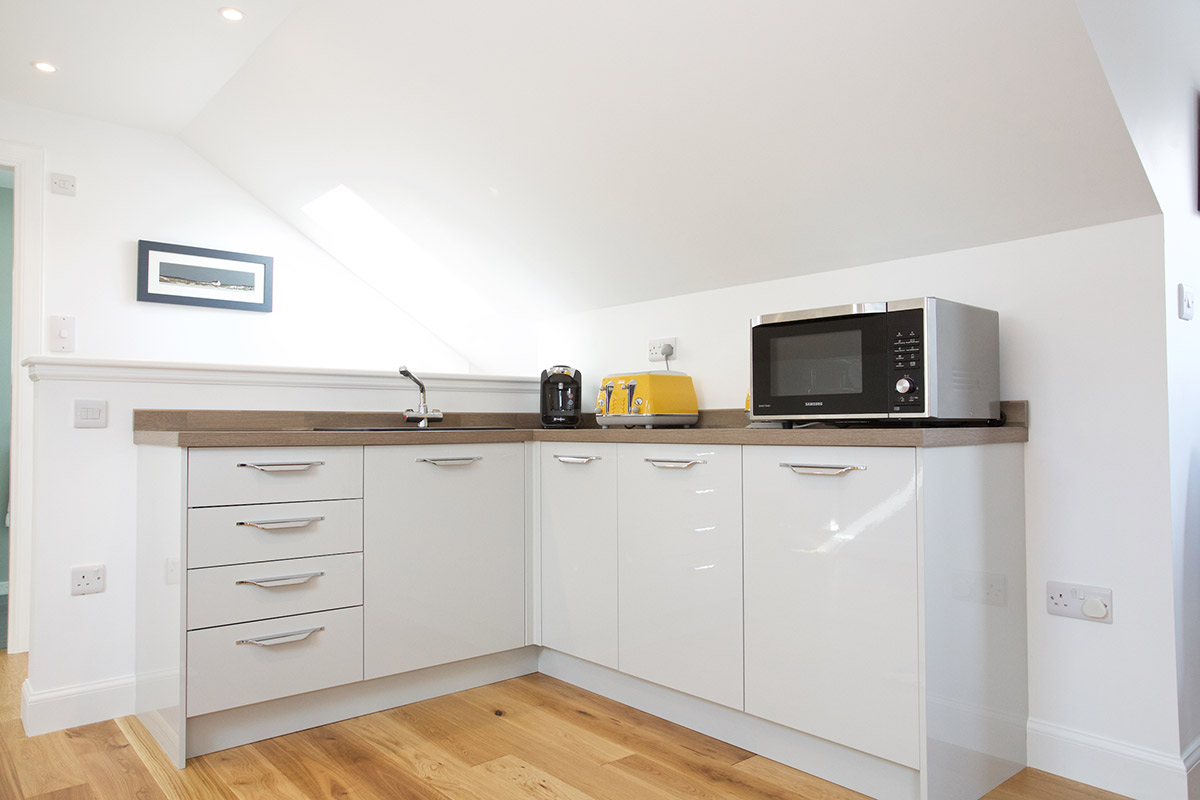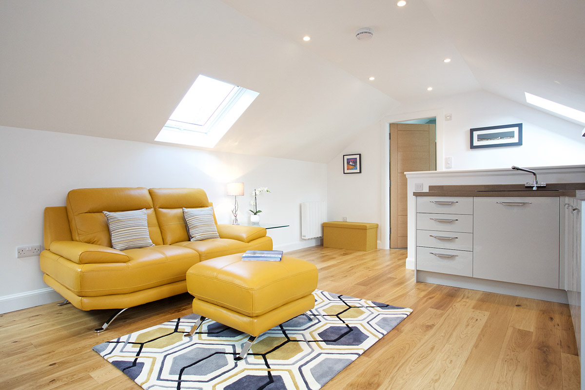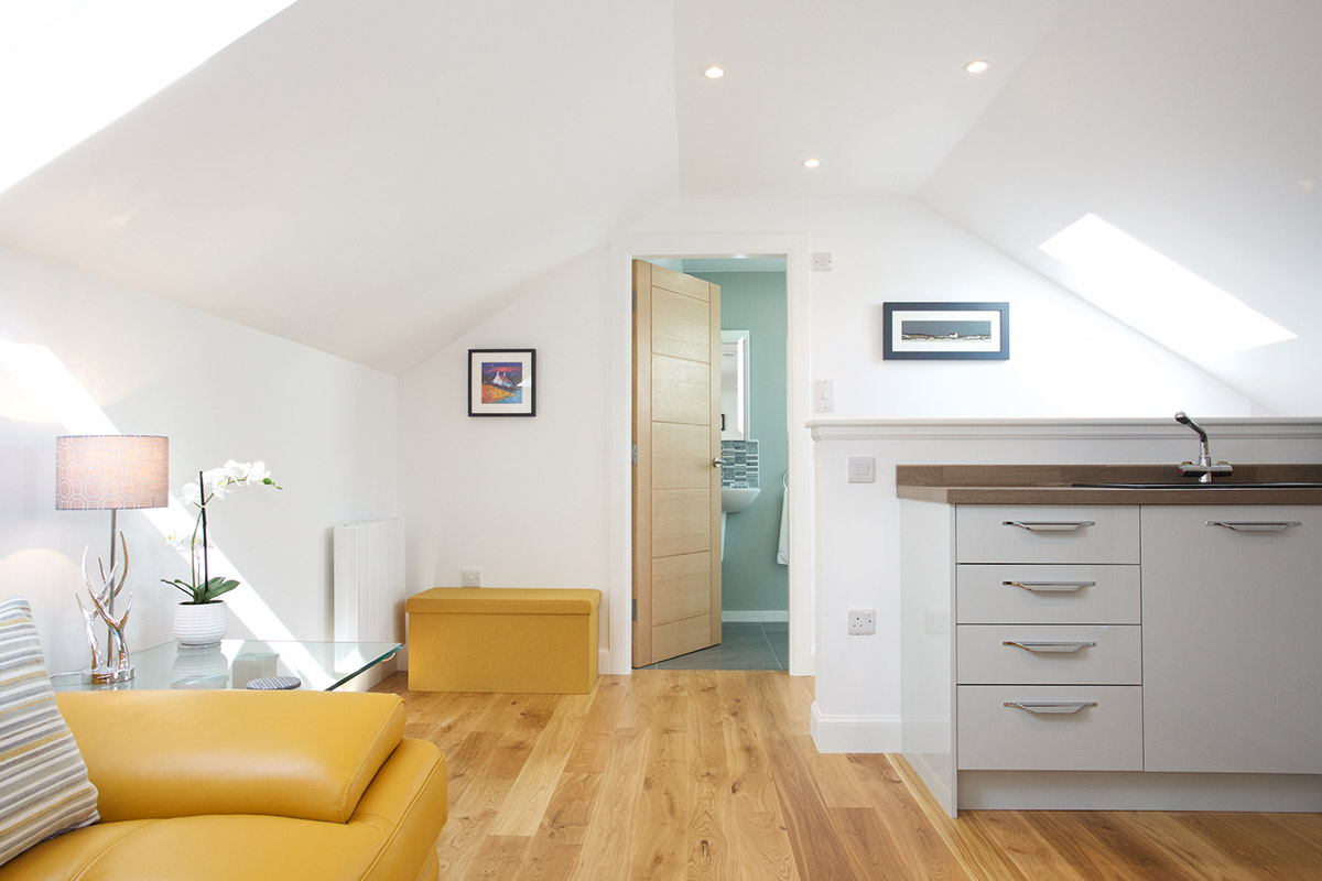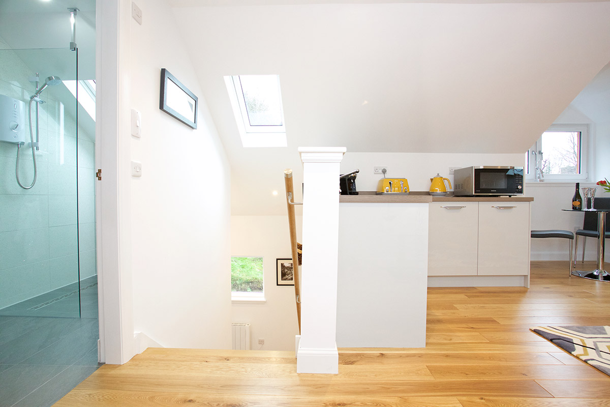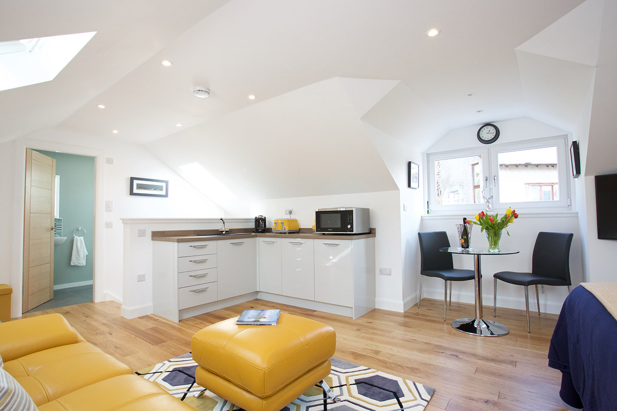 The entrance door opens into a light hallway with an internal staircase leading to the apartment. The spacious open plan studio has a comfortable sitting area, a dining area with seating for two, a luxurious King-sized bed, a well-equipped kitchen and a large ensuite with walk in shower.